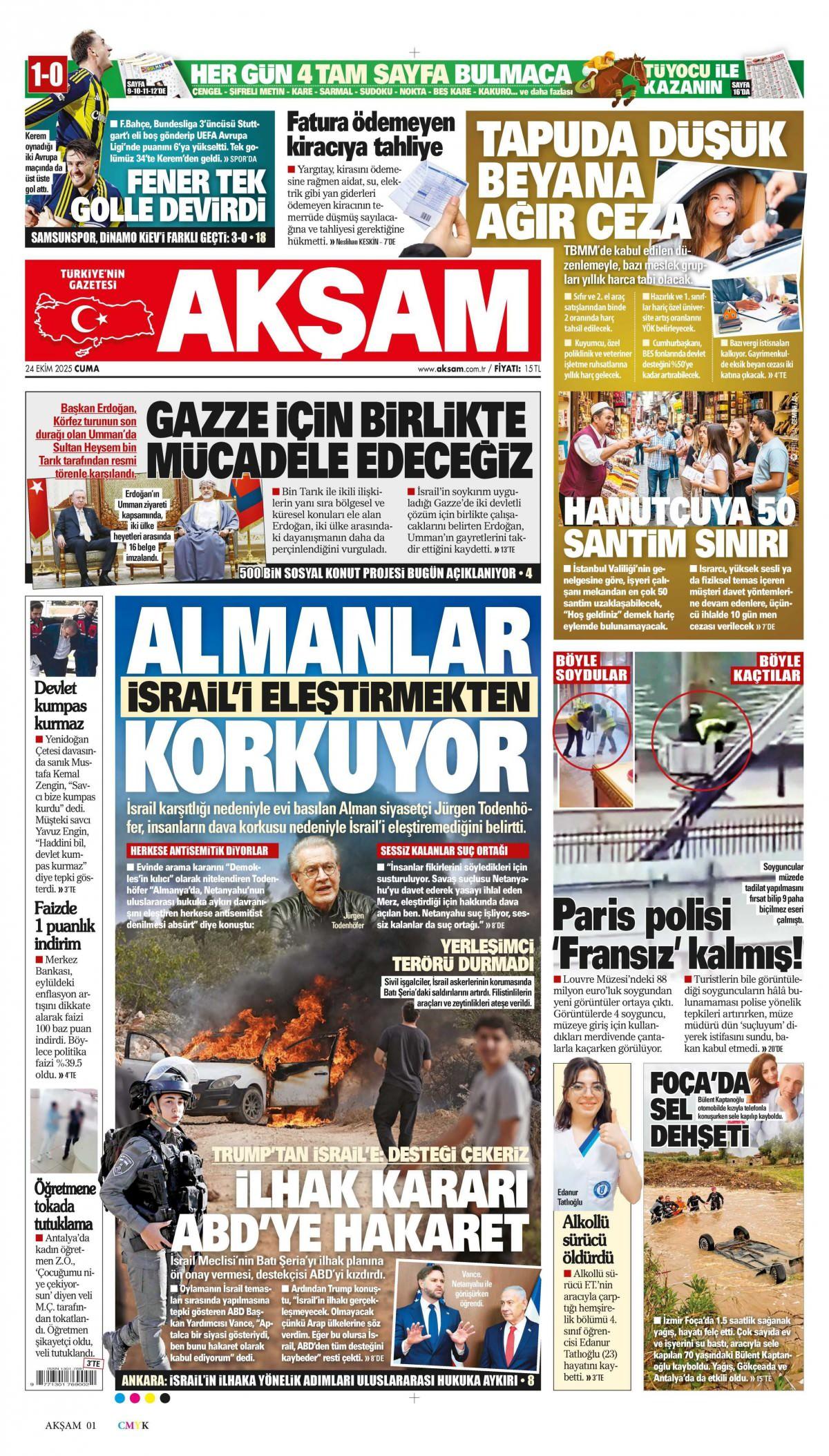 Akşam Gazetesi 24 Ekim 2025 Günü Manşeti