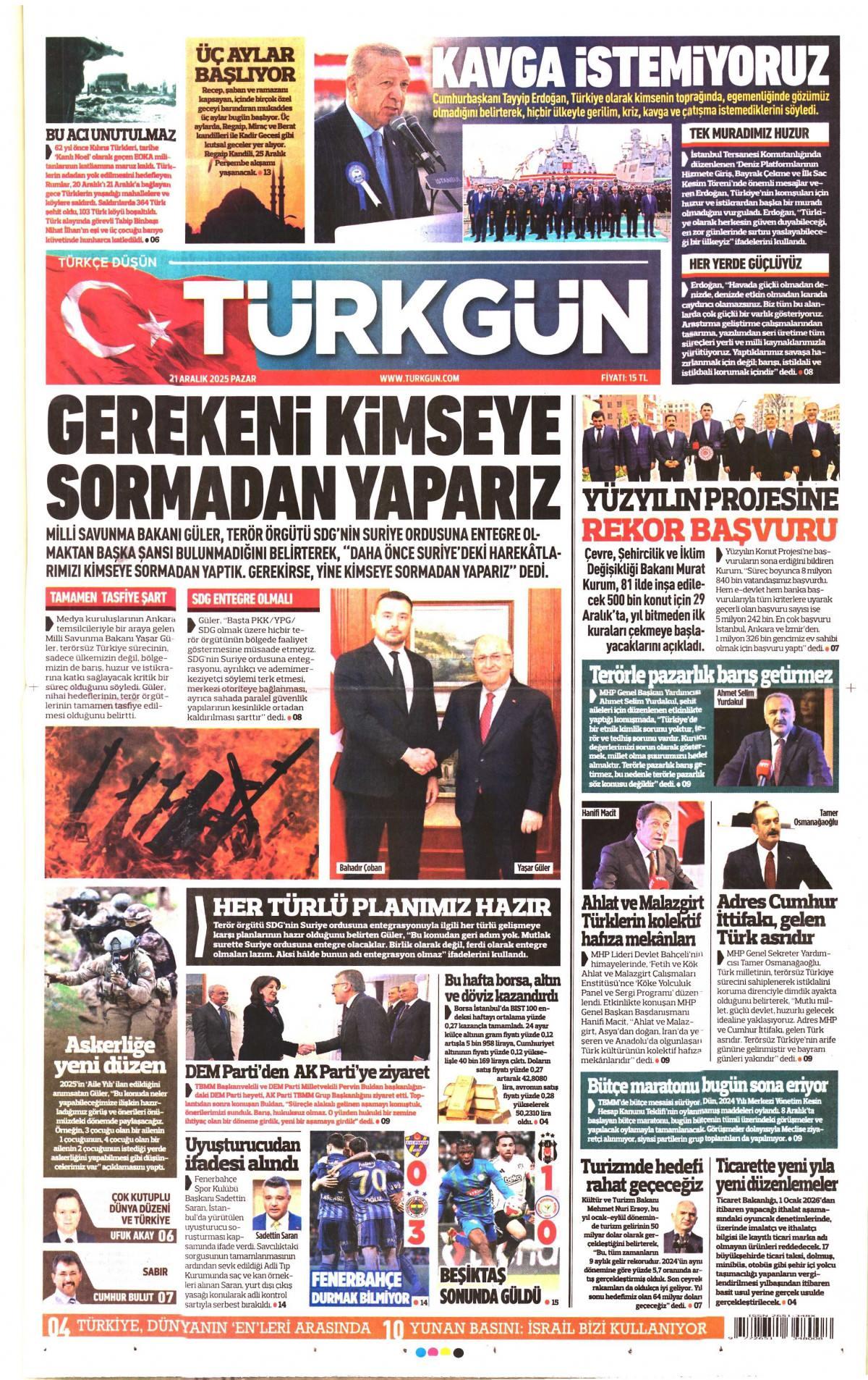 Türkgün Gazetesi 22 Aralık 2025 Günü Manşeti